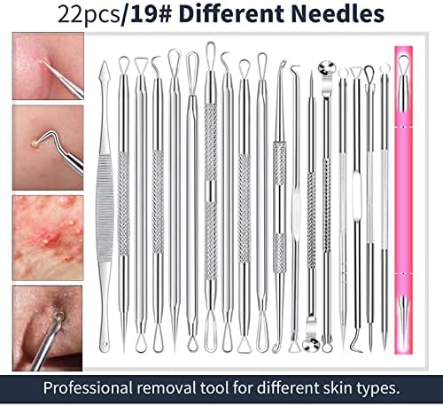 22Pcs Blackhead remover tool offers the most comprehensive set of tools available on the market. Additionally, it includes magnifying glass and alcohol pads.
