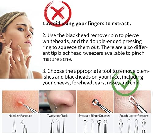 ✔ Squeezing blackheads with your fingers is not recommended as it increases the risk of infection. Instead, you can use the blackhead remover tool that comes with a pin to pierce whiteheads, a double-ended pressing ring, or different tip tweezers to extract mature acne.
