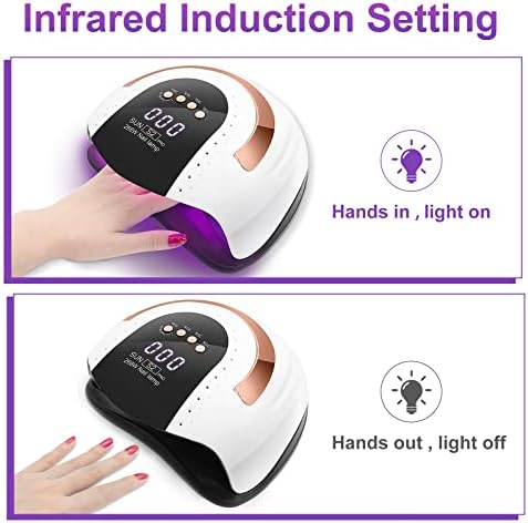 【High Power Dual Light Source】Our 268W UV LED Nail Lamp is designed with high power dual light sources, making gel polish cure faster and reducing drying time. With 57 evenly distributed UV+LED bulbs, this lamp ensures even drying of your nails. It is suitable for curing a variety of gels, including primer, topcoat, UV glue, building glue, gem glue, polyglue, and color polishing, providing professional results.We suggest do not let the lamp working continuously more than 2 hours.