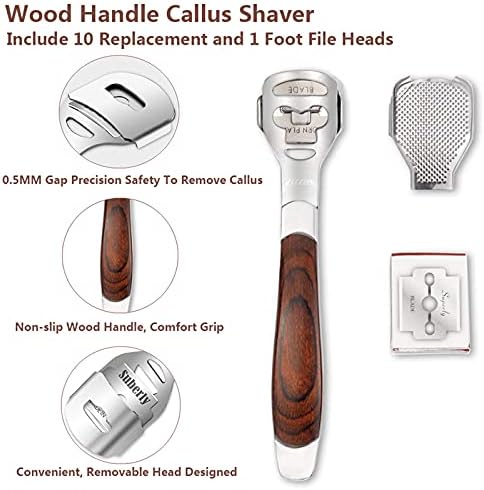 Wood Handle Callus Shaver: contains 10 Replacement & 1 Foot File Heads, 0.5mm gap precision and safety to remove callus, cracked, hard and dead skin on foot, removable head designed, very convenient to change, Solid wood handle provides most comfortable grip and smooth control.