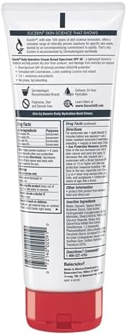 Eucerin Daily Hydration Cream SPF 30 provides 24-hour moisture to dry skin while protecting it from sunburn and long-term skin damage with Broad Spectrum UVA/UVB protection. UV light is the main cause of sun-induced skin damage and a major risk factor for most skin cancers. This fast-absorbing sunscreen moisturizer for dry skin is non-greasy, and is enriched with Pro-Vitamin B5 and Sunflower Oil. This Eucerin body cream for dry skin is a lightweight 2-in-1 moisturizer and Broad Spectrum sunscreen that is fragrance free and dye free, and the sunscreen SPF 30 is safe for sensitive skin. This body moisturizer SPF is perfect for those looking for a dry skin body sunscreen that helps protect skin from sunburn and long-term skin damage when used as directed. For sunscreen use, apply this Eucerin sunscreen cream liberally 15 minutes before sun exposure. Use a water resistant sunscreen if swimming or sweating. Reapply at least every 2 hours. Eucerin is a dermatologist-recommended skincare brand that is based on an uncompromising approach to science. With skin care products designed to restore and sustain healthy-looking skin, families everywhere look to Eucerin to enhance outer beauty and self-confidence.