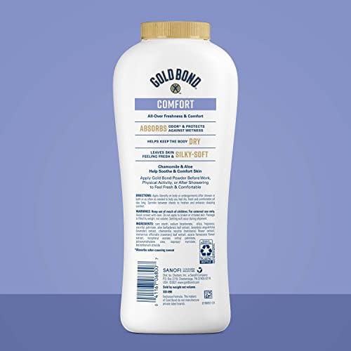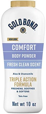 Keep skin feeling fresh and comfortable all day with Gold Bond Comfort Body Powder, now in a talc-free formula. This body powder for women and men provides gentle odor control* and protects against wetness to keep your skin feeling silky soft. Gold Bond Comfort Powder is formulated with aloe and chamomile to soothe skin irritation. This gentle body powder also features vitamins A, C, and E to nourish skin. Best of all, this body powder comes in a fresh, clean scent. A few shakes is all it takes for total body freshness and comfort on arms, legs, feet, back, and torso. *Absorbs odor-causing sweat