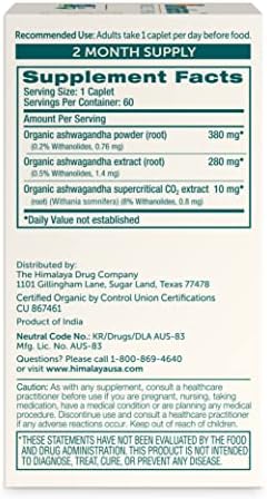 Himalaya Organic Ashwagandha, 60 Day Supply, Herbal Supplement for Stress Relief, Energy Support, Occasional Sleeplessness, Organic, Non-GMO, Vegan, Gluten Free, 670 mg, 60 Caplets