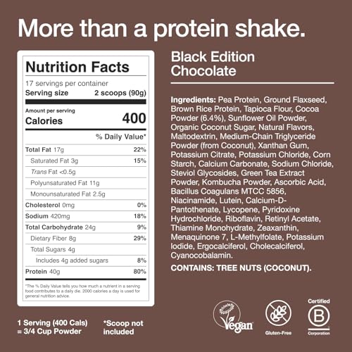 BLACK EDITION: Power your potential with super high-protein and super-convenient meals. 40g protein, 100% plant-based, 27 essential vitamins and minerals plus slow-release complex carbs and 8g fiber.