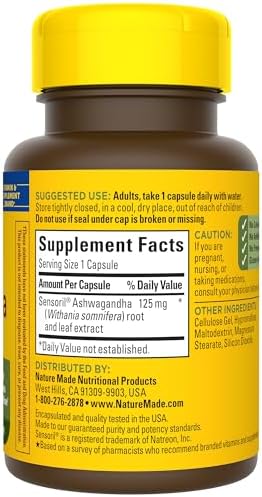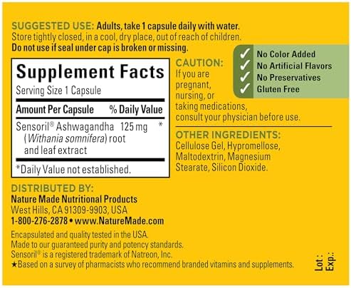 Nature Made Ashwagandha Capsules are dietary supplements using clinically studied Sensoril Ashwagandha to reduce stress and occasional anxiousness (1). In a clinical study, participants reported decreased stress in 4 to 8 weeks. Sourced from high-quality ingredients, this gluten free Ashwagandha for men and women dietary supplement contains no color added, no artificial flavors and no preservatives. Long revered in Ayurvedic medicine, ashwagandha helps reduce stress. These Nature Made stress supplements contain Sensoril Ashwagandha, which reduces perceived stress and cortisol to help restore balance to the adrenals. This supplement uses an Ashwagandha root and leaf extract. Adaptogens such as Ashwagandha may help the body adapt to and reduce stress. These Ashwagandha supplements are perfect for any adult looking to help reduce stress in their lives. Adults, take one Ashwagandha capsule daily with water. (1) Sensoril is clinically studied to reduce cortisol and perceived stress. *Based on a survey of pharmacists who recommend branded vitamins and supplements.