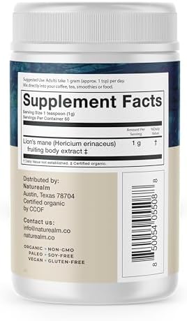 Naturealm – Lion’s Mane Mushroom Powder – Filler-Free – Organic – 100 Percent Fruiting Bodies, 60-Day Supply
