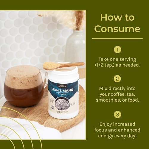 OTHER FORMS OF ORGANIC LION’S MANE: Adding 1 teaspoon of Lion’s Mane Powder to your coffee, tea, smoothie, or food is only one way to add brain, nerve, and immune health benefits to your daily routine. Naturealm also offers a Lion’s Mane Mushroom Tincture to add to your beverage of choice or take sublingually under your tongue and Lion’s Mane Capsules, which Naturealm suggests adults take 3 of per day.