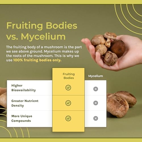 100% MUSHROOM FRUITING BODIES: This mushroom blend contains only whole fruiting bodies instead of mycelium and substrate, which are full of useless starchy fillers. Our hot water process breaks down mushrooms’ cell walls using ultra-purified water to optimize beneficial compounds’ bioavailability, yielding nutrient-dense mushroom powders with micro and macronutrient profiles for wellness and dietary health. This includes more protein and higher beta-glucan and antioxidant content.