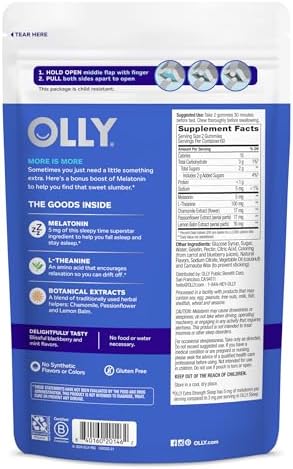 OLLY Extra Strength Sleep gummies for adults deliver a delightful blend of active ingredients that work together to promote restful sleep so you wake up feeling refreshed. These 5mg Melatonin gummies, with L-Theanine to work with your body to help you fall asleep and stay asleep.* Includes traditional Botanical Extracts like Chamomile and Lemon Balm. Deliciously flavored with Blackberry and a hint of mint with other natural flavors, these Sleep gummy supplements help you drift off.* They’re delightfully tasty, scientifically formulated and gluten-free. *These statements have not been evaluated by the Food and Drug Administration. This product is not intended to diagnose, treat, cure or prevent any disease. For occasional sleeplessness. CAUTION: Melatonin may cause drowsiness or sleepiness; do not take while driving, operating machinery, or engaging in any activity that requires alertness. This product is not intended to treat insomnia or other sleep disorders.