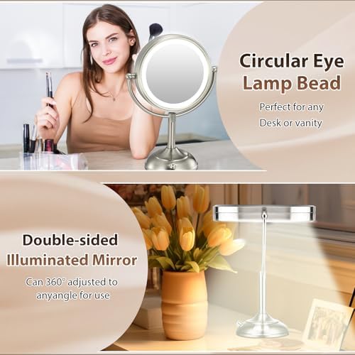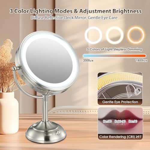 【Optional 3 Color Lights Widely Use】Our makeup mirror with lights and magnification provides 3 light sources of white, warm and natural light, to create the most perfect makeup under various lighting situations like working, party, and outdoor environments. Just press one button to switch mode. No more makeup disaster! Not only a make up mirrors lighted, it can be a desk lamp, night light, and ambient light with the most professional light source