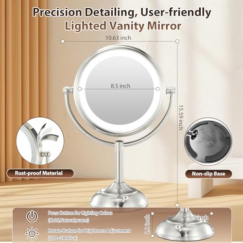 Professional 8.5″ Large Lighted Makeup Mirror with Brighter Lights, 1X/10X True HD Magnifying Mirror with 3 Color Dimmable Lights, 80 Shadowless LEDs, 360°Swivel Seamless Vanity Mirror, Pearl Nickel