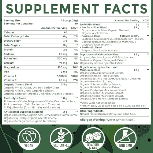 Super Greens Powder Superfood Supplement + Electrolytes & Tonic Herbs | Organic Greens, Adaptogens, Shilajit, Antioxidants, Preobiotic & Probiotic & Postbiotic | for Gut, Energy & Immune | 30 Servings